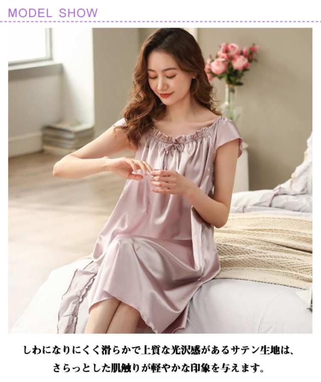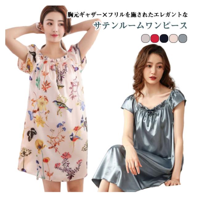 | 胸元ギャザー×フリルを施されたエレガントなサテンルームワンピース。 しわになりにくく滑らかで上質な光沢感があるサテン生地は、さらっとした肌触りが軽やかな印象を与えます。 1枚でルームウエアや部屋着などとしても活躍するアイテムです。 | |