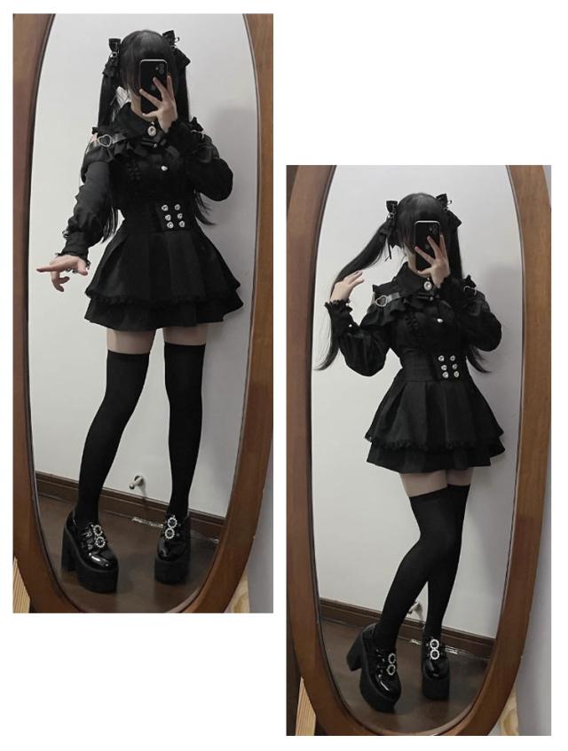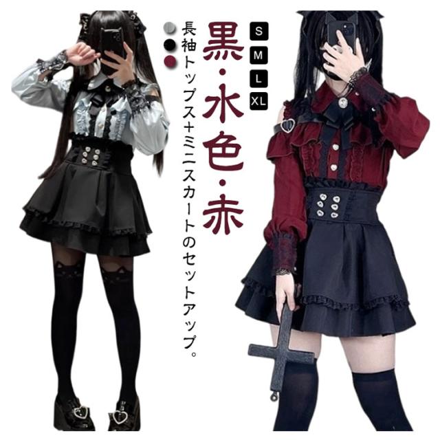 | 長袖トップス+ミニスカートのセットアップ。【黒?水色?赤】【S-XL】 ブラウス:お洒落なオープンショルダーのデザインで、女性らしいフェミニンな雰囲気が溢れる。肩にはキラキラしたハートバックル付きで可愛い。袖口にも黒レース付きで、華やかさがUP。リボンブローチが取り外し可能です。 ミニスカート:ウエストに付いている飾り用ハートボタンがポイント。Aライン&ハイウエストのスカートは着痩せ・高見え効果が抜群。ウエストにはゴム付きです。(インナーパンツなしです) 幅広く活躍:量産型、地雷系、ガーリー系、ロリータ系コーデにおすすめです。女子会、デートなど様々なシーンで幅広く活躍中。お洒落で可愛いデザインで、プレゼントとしてもピッタリです。 | |
