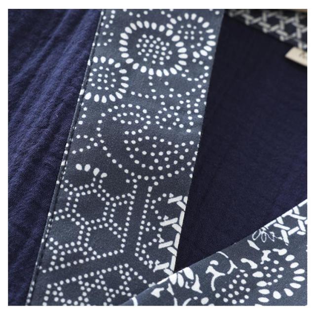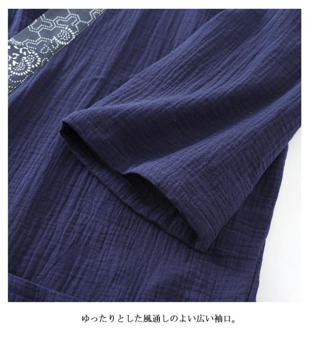 | さらりと涼しく浴衣風ロング丈甚平。 綿素材は繰り返し洗濯しても劣化しにくいので、オールシーズで長く着用できるのも魅力。 左側にポケット一つ付いています。 ゆったりとした風通しのよい広い袖口。 内側と外側の2箇所をつけひもで結び仕立てです。 帰宅後、入浴後などの場合で、このソフトな生地に触ると、フワフワとストレスがなくなって、快適な感じがすることができます。 | |