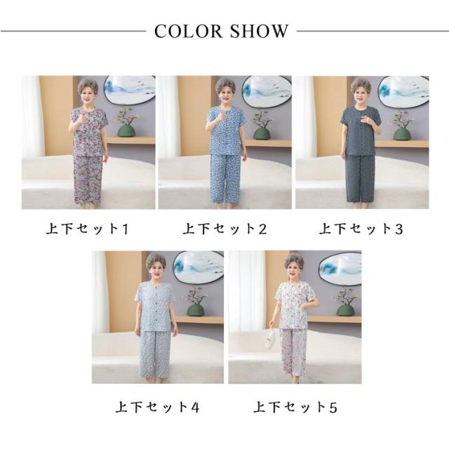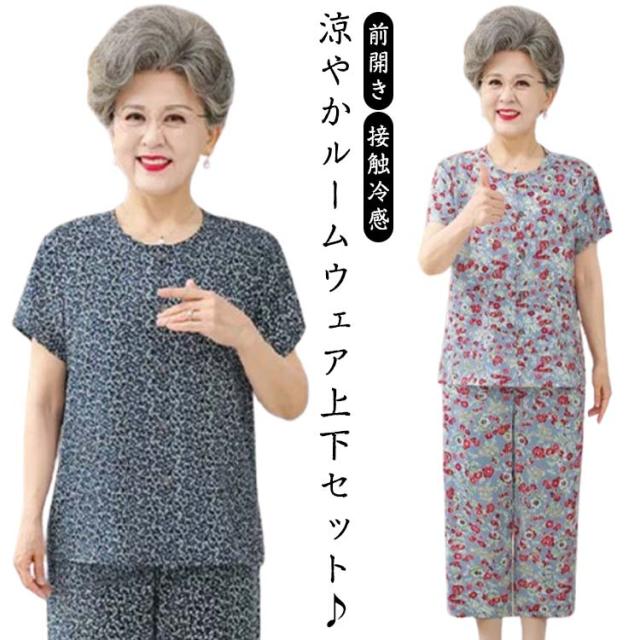 ルームウェア ミセス 夏用 パジャマ 部屋着 さらっとクール 9分丈パンツ 半袖 夏用 上下セット 前開き 接触冷感 冷たい 涼感 涼しい 花柄 総柄 クルーネック 入院着 レーヨン リラックスウェア