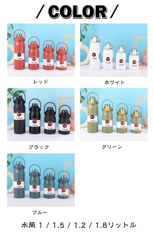 | 水筒 1 / 1.5 / 1.2 / 1.8リットル ステンレス真空二重構造で保冷・保温力がUP!飲み物の温度を長時間キープ。 持ち手は付きので、カラビナやフックにかけて持ち運んだり、吊り下げ用途にも。 サイクリング、ハイキング、キャンプ、ランニング、旅行、登山などのアウトドア活動に使用できる。 | |