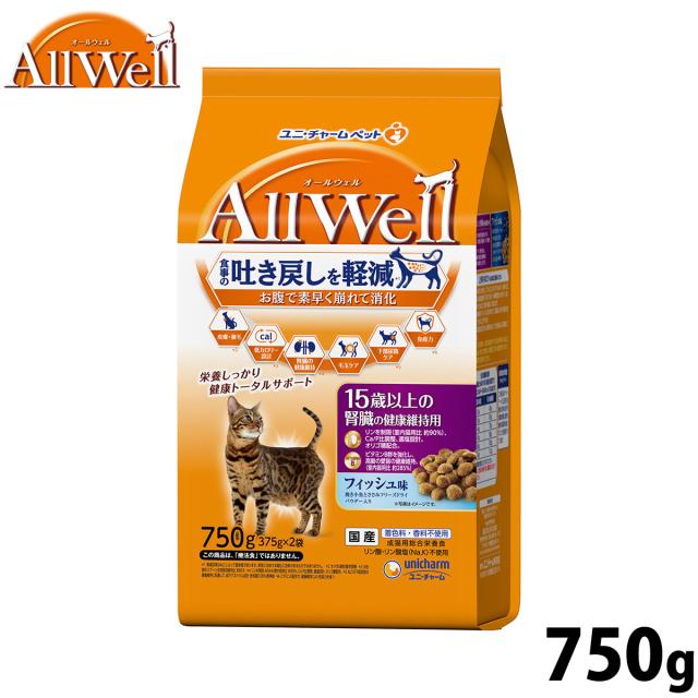 AllWell オールウェル キャットフード 15歳以上の腎臓の健康維持用 フィッシュ味 挽き小魚とささみフリーズドライパウダー入り 750g(375g×2袋)