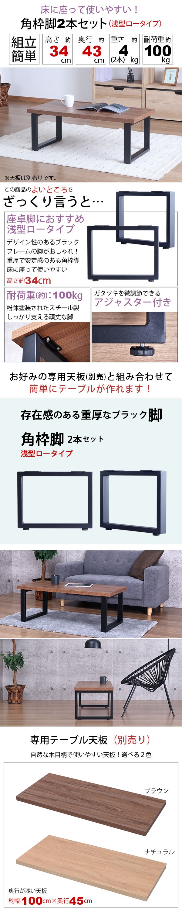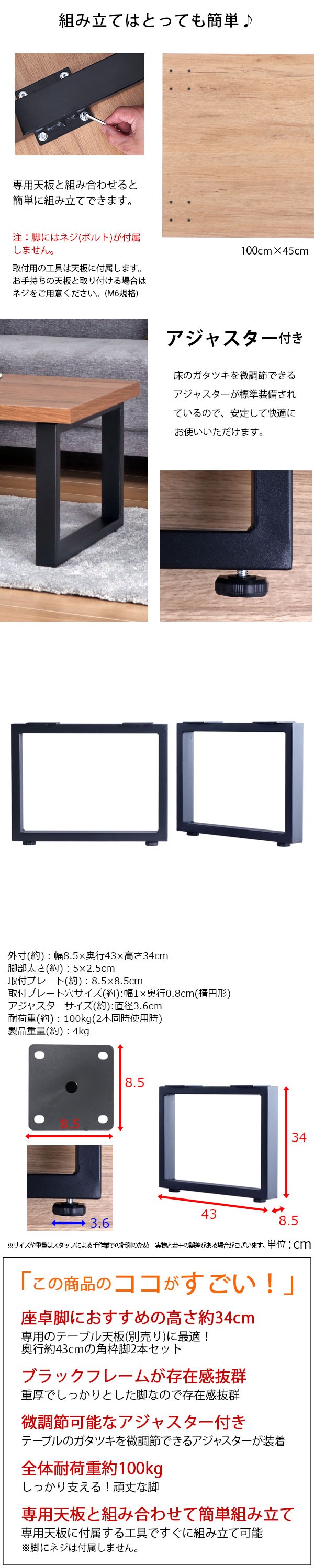 家具通販 インテリア通販>テーブル通販>DIYテーブル 天板 脚 パーツ通販>テーブル脚のみ>2本セット>角枠脚タイプ>ロータイプ、ローテーブル用、座卓用>高さ34cm>アジャスター付き
