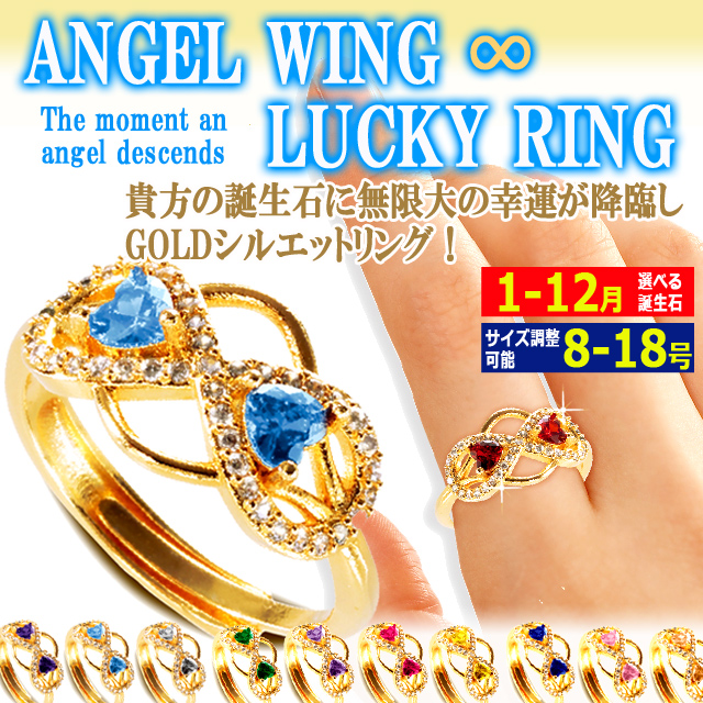 エンジェルウイング∞!バースデーリングプレミアムGOLD ジルコニア 誕生石 無限大 幸運 サイズ調整可能 ラッキーストーン 指輪 アクセサリー
