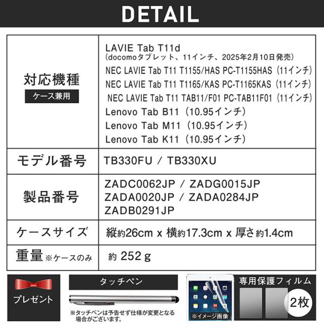 ■LAVIE Tab T11d (docomoタブレット、11インチ、2025年2月10日発売) ■NEC LAVIE T11 T1155/HAS PC-T1155HAS (11インチ) ■NEC LAVIE T11 T1165/KAS PC-T1165KAS (11インチ) ■NEC LAVIE T11 TAB11/F01 PC-TAB11F01 (11インチ) ■Lenovo Tab B11(10.95インチ) ■Lenovo Tab M11(10.95インチ) ■Lenovo Tab K11(10.95インチ) ※モデル番号:TB330FU、TB330XU ※製品番号:ZADC0062JP/ZADG0015JP/ZADA0020JP/ZADA0284JP/ ZADB0291JP/ZADB0291JP/ZAE20001JP ※上記7機種兼用ケースです。機種の間違いにご注意ください。 ※ご不明の場合は当店までお問い合わせいただきますようお願いいたします。 |