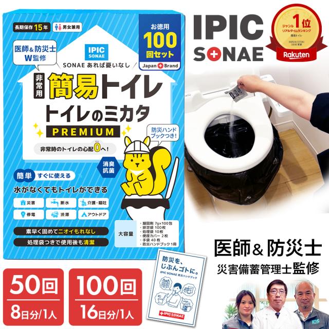 【公式】IPIC SONAE 非常用トイレ トイレのミカタPREMIUM 100回分 汚物用袋付き 15年保存 災害 防災 断水 簡易 備蓄 プレミアム