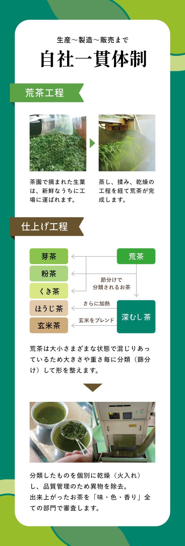 その葉を、通常の2〜3倍の時間をかけて葉の芯までしっかりと深く蒸すことにより、成分が分解され、タンニン(苦渋味)が減り、アミノ酸のテアニン(甘み)が増してまろやかで緑色の濃いお茶に出来上がります。