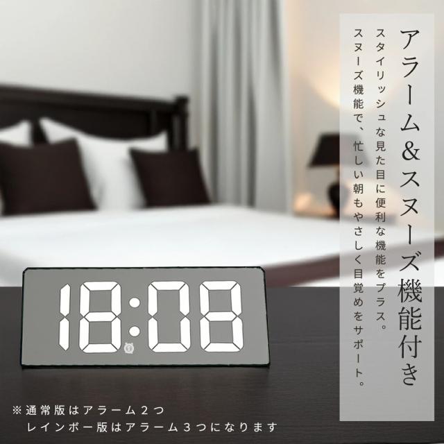 通常版はアラーム2つ・省電力モード対応、レインボー版はアラーム3つ搭載で画面のオンオフも手動で切り替え可能