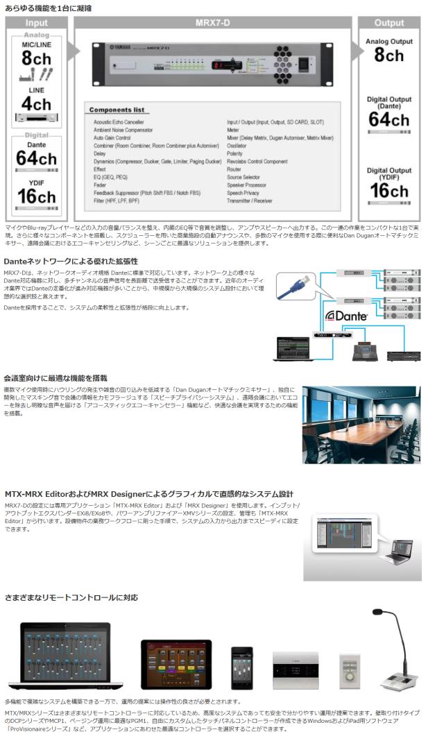 MRX7-Dは大容量のDSPエンジンを搭載し、64x64のマトリクスを有するフリーコンフィギュレーション方式のシグナルプロセッサーです。コンポーネントを組み合わせて自在に配置することで、用途に合わせた柔軟なシステム構築が可能です。デジタルネットワークオーディオ規格 Danteに標準で対応しており、ヤマハのデジタルミキシングコンソールを始めとするDante対応機器と組み合わせることで、大規模で複雑なシステムにも対応します。