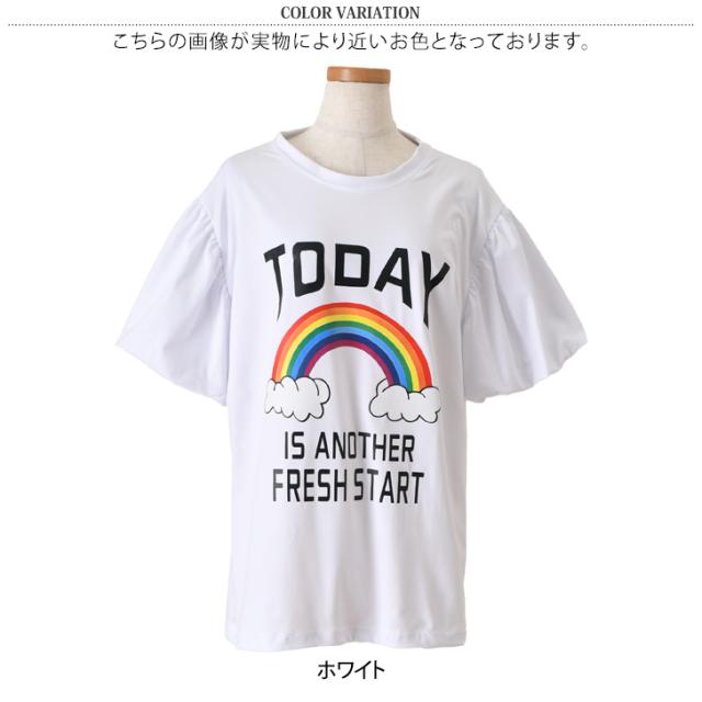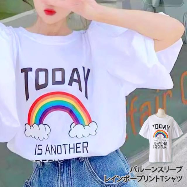 新作 バルーンスリーブレインボープリントロング丈Tシャツ レディース トップス カットソー 夏 半袖 5分袖 涼しい ゆったり カジュアル 韓国 おしゃれ プリントT ロゴT 体型カバー シンプル かわいい ポップ