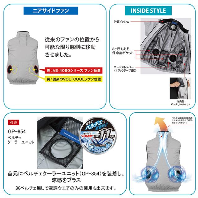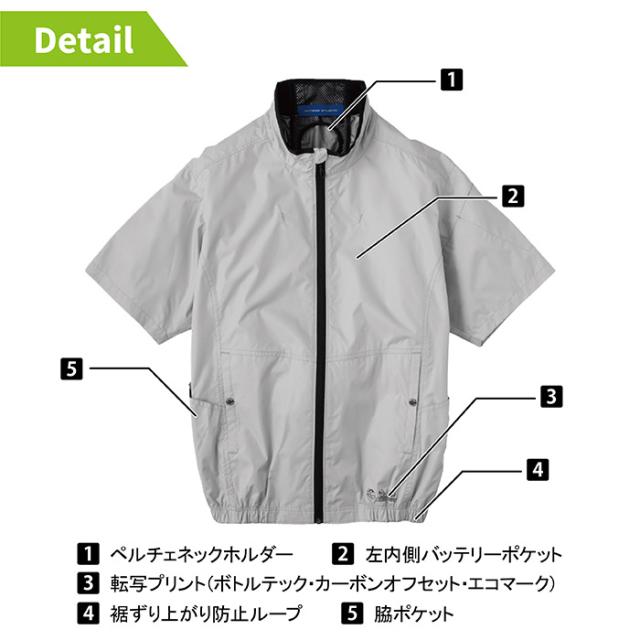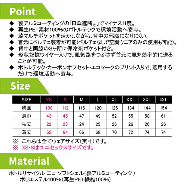 ◇機能:ニアサイドファン・衿台メッシュ・衿ワイヤー入り・背中風気路・裾ずり上がり防止ループ・左袖マルチポケット・保冷剤ポケット3箇所・両脇ポケット(コードホール付き)