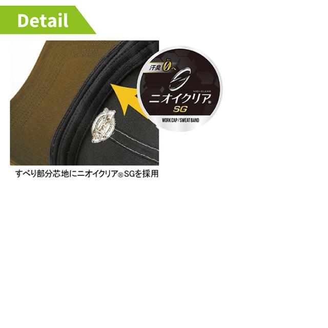 ◇帽子と内側の頭との接触部分(すべり部分)にニオイクリア芯地と吸汗のドライメッシュ素材を使用し快適さをプラス