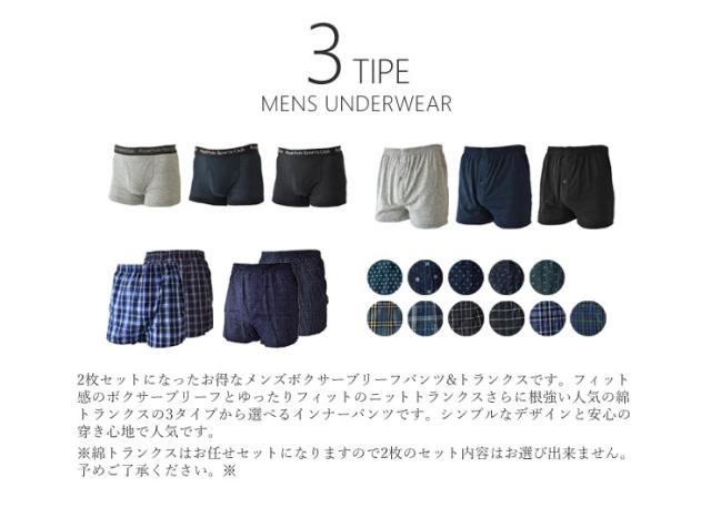 2枚セットになったお得なメンズボクサーブリーフパンツ&トランクスです。フィット感のボクサーブリーフとゆったりフィットのニットトランクスさらに根強い人気の綿トランクスの3タイプから選べるインナーパンツです。シンプルなデザインと安心の穿き心地で人気です。