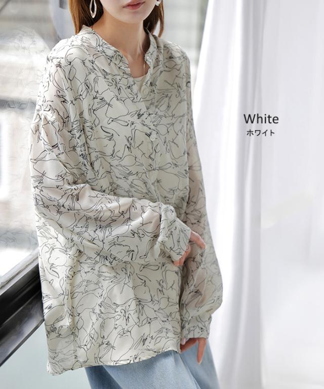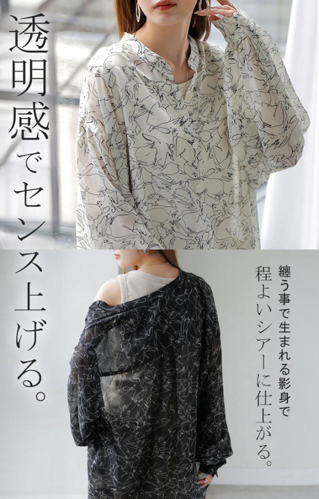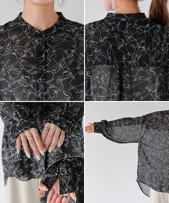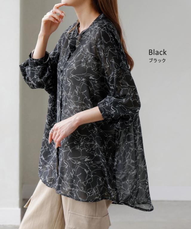 シャツ レディース ノーカラー シアー 総柄 トップス バンドカラー シワになりにくい ブラウス ロング ロングシャツ チュニック 長袖 羽織 ライトアウター きれいめ ゆったり 大きいサイズ 体型カバー 透け お尻が隠れる 黒 白 春 夏 HUG.U 秋新作