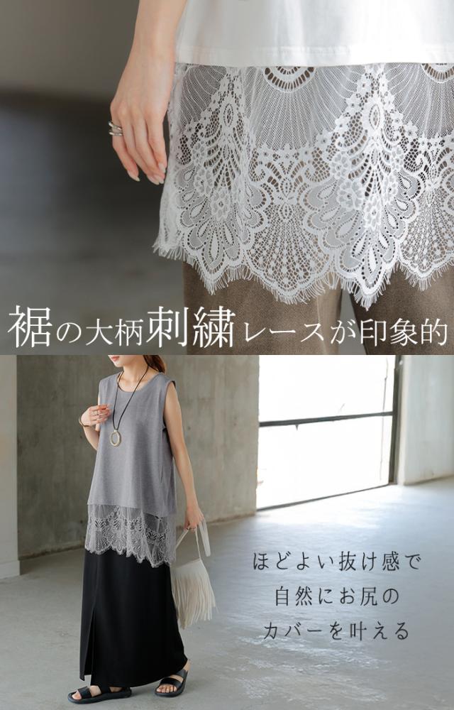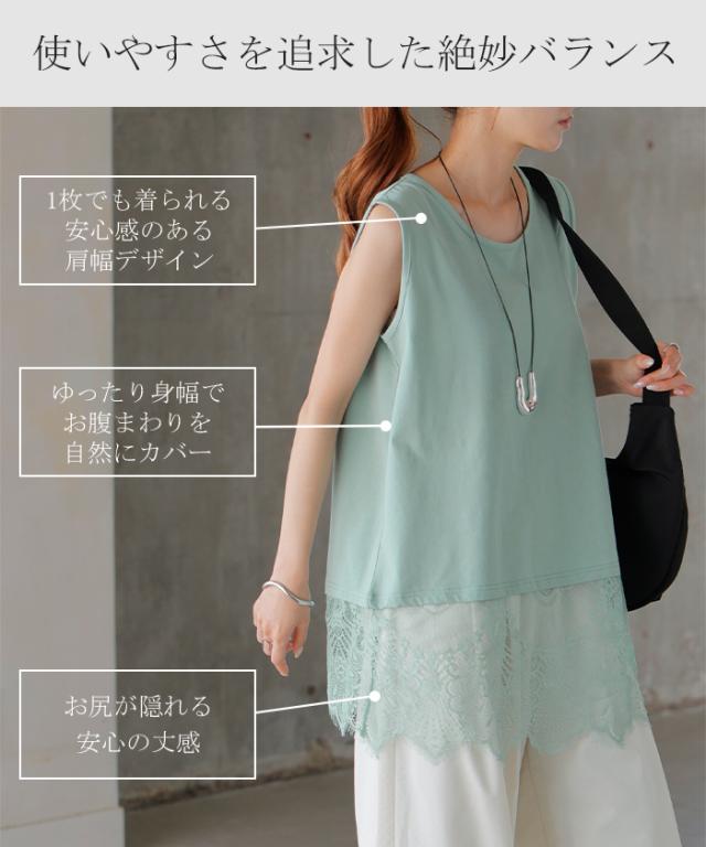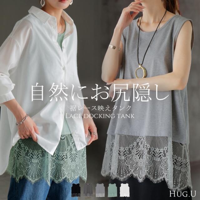 タンクトップ レイヤード レース インナー トップス 4月下旬入荷 タンク 綿 混 レディース ノースリーブ 花柄 ロング Uネック チュニック 長い 重ね 付け裾 ボックス 裾 ゆったり ストレッチ 体型カバー 大きいサイズ きれいめ お尻が隠れる 黒 白 春 夏 HUG.U 秋新作