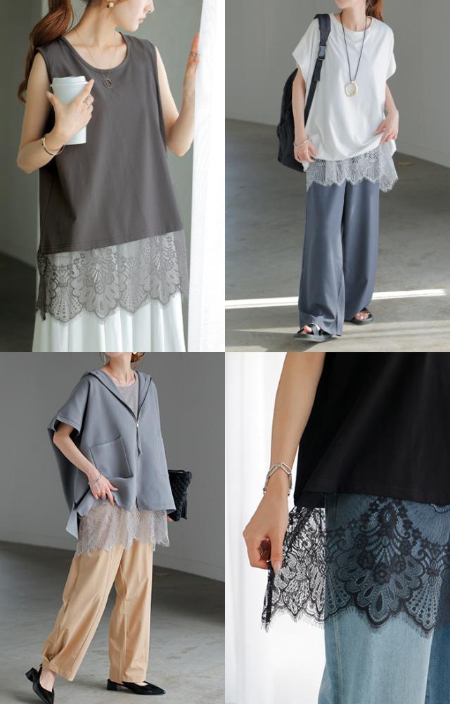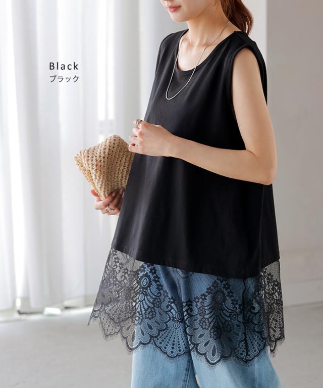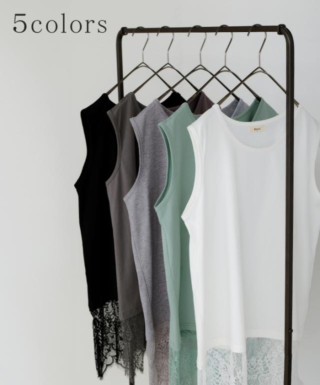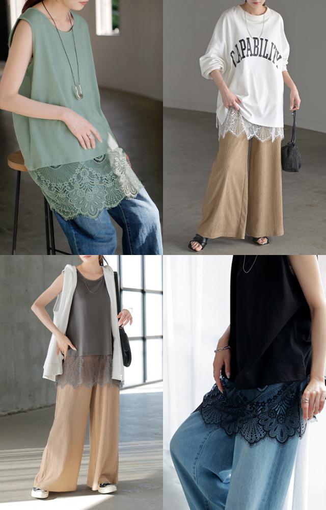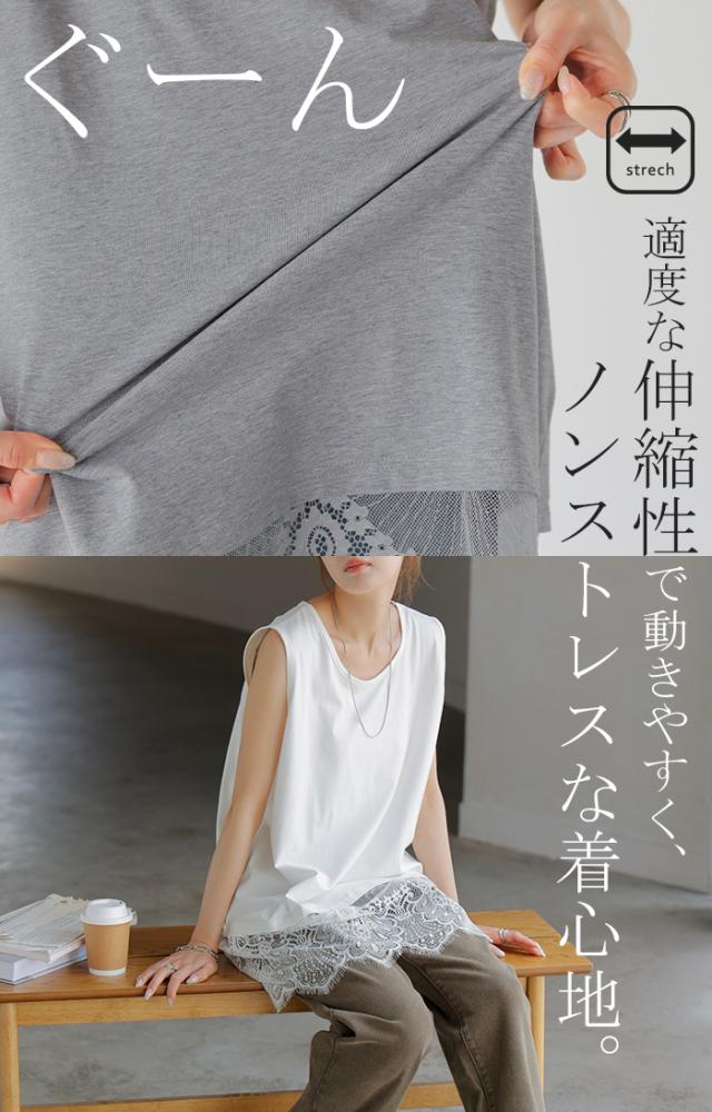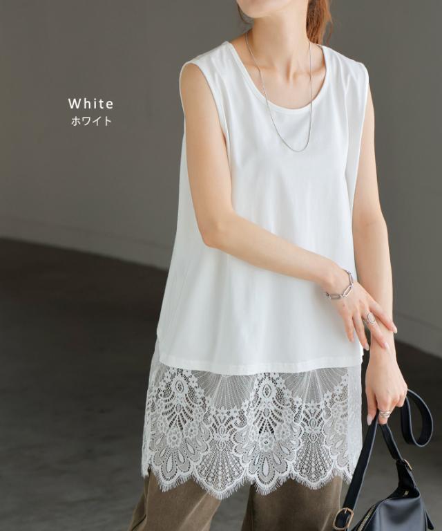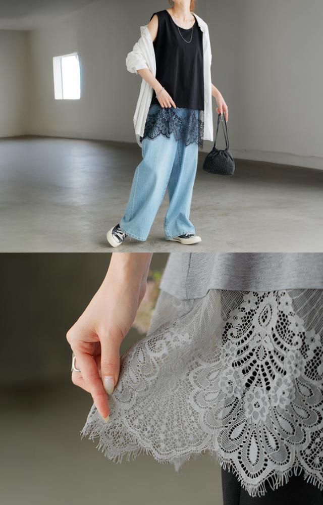 ドッキングデザインで華やかな印象の裾レースタンクトップです。