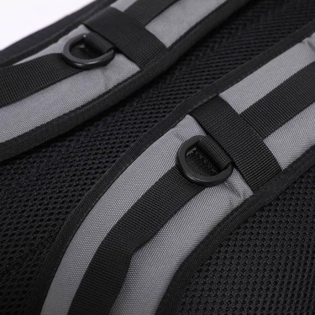背面は蒸れを軽減するメッシュパネルと安定性を高めるチェストベルト付き。