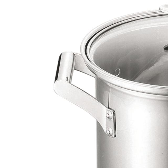 | 材質 | 【本体】アルミクラッド三層鋼 外側:ステンレス(SUS430=クローム18%、ニッケル0%) 内部:アルミニウム 内側面:ステンレス(SUS304=クローム18%、ニッケル8%) 【持ち手】18-8ステンレス 【フタ】18-8ステンレス 【ストレーナー(カゴ)】18-8ステンレス |