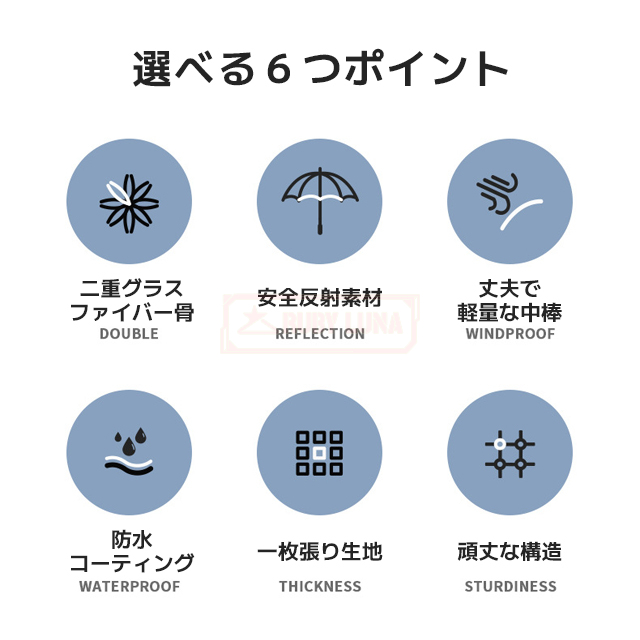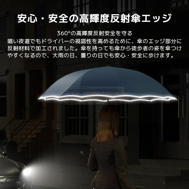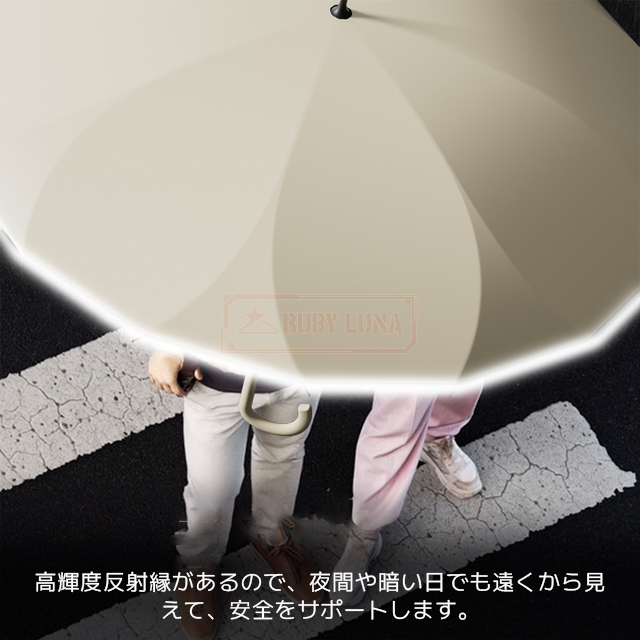 | 安心・安全の高輝度反射傘エッジ | ◆360°の高輝度反射安全を守る ◆暗い夜道でもドライバーの視認性を高めるために、?のエッジ部分に反射材料で加工されました。?を持っても?から徒歩者の姿を?つけやすくなるので、大雨の日、曇りの日でも安心・安全に歩けます。 |