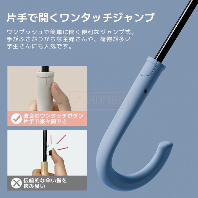| 片手で開くワンタッチジャンプ | ◆ワンプッシュで簡単に開く便利なジャンプ式。 ◆手がふさがりがちな主婦さんや、荷物が多い学生さんにも人気です。 |