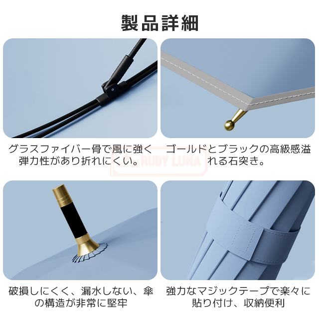 | 素材 | ◆傘布素材:高密度ブラックラバー耐衝撃布 ◆ 傘骨素材:グラスファイバー |