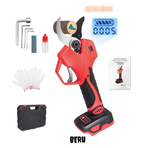 【SK5ブレード・ハサミ 切れ味抜群】:ハサミの刃は高品質のSK5高炭素テフロン鋼から作られて高硬度で切れ味抜群です。はさみ本体にブラシレスモーター搭載してパワーが強くて、40mmまでの生木を1秒に瞬時に切断でき、切れ味が良くて切断面が平にキレイ、植木の健康を守れます。同時に、電動剪定ばさみの切断回数とバッテリー残量の表示画面が設計されたため、一目で分かります。