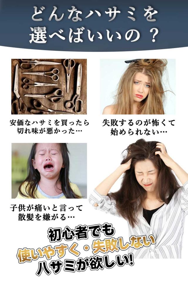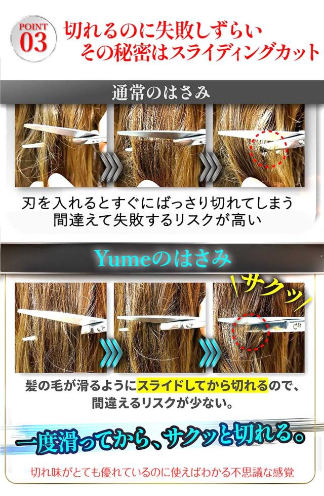 【切れるのに失敗しない”スライディングカット技術”】セルフカットでは、少しずつ微調整しながら切り進めることが大切。従来の散髪ばさみは、刃を入れるとすぐばっさり切れてしまうため失敗しやすくなっていました。Yumeの散髪はさみは、髪の毛が一度刃に沿ってスライドしてから切れる”スライディングカット技術”を採用。切れ味はいいのに失敗するリスクを減らすことに成功しました。