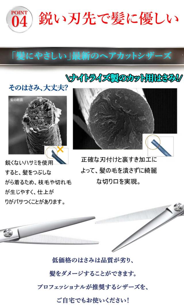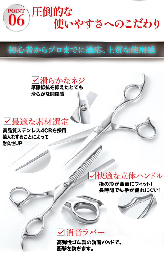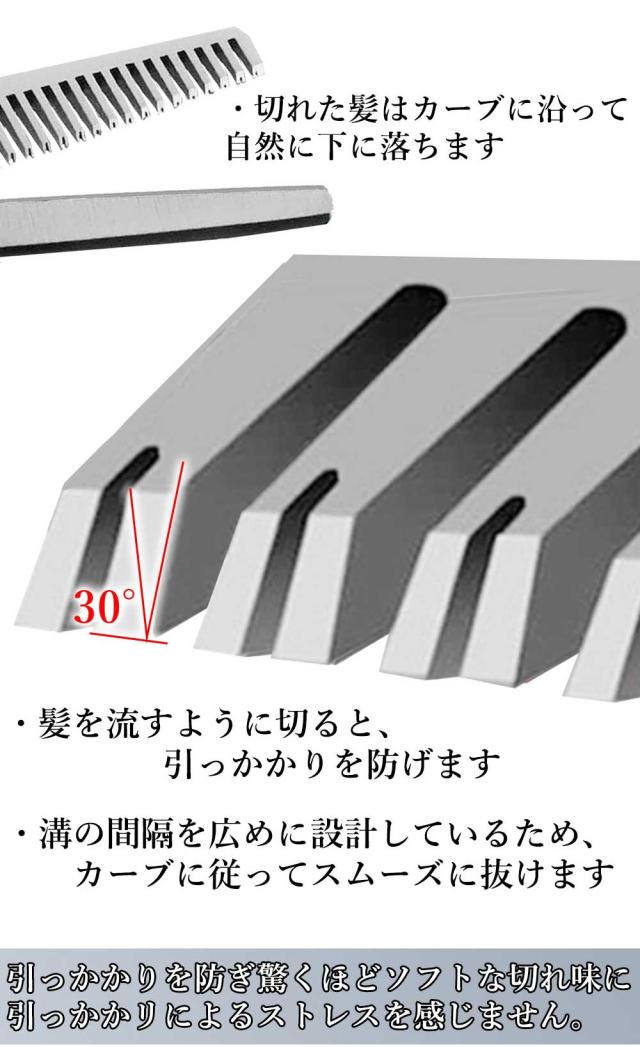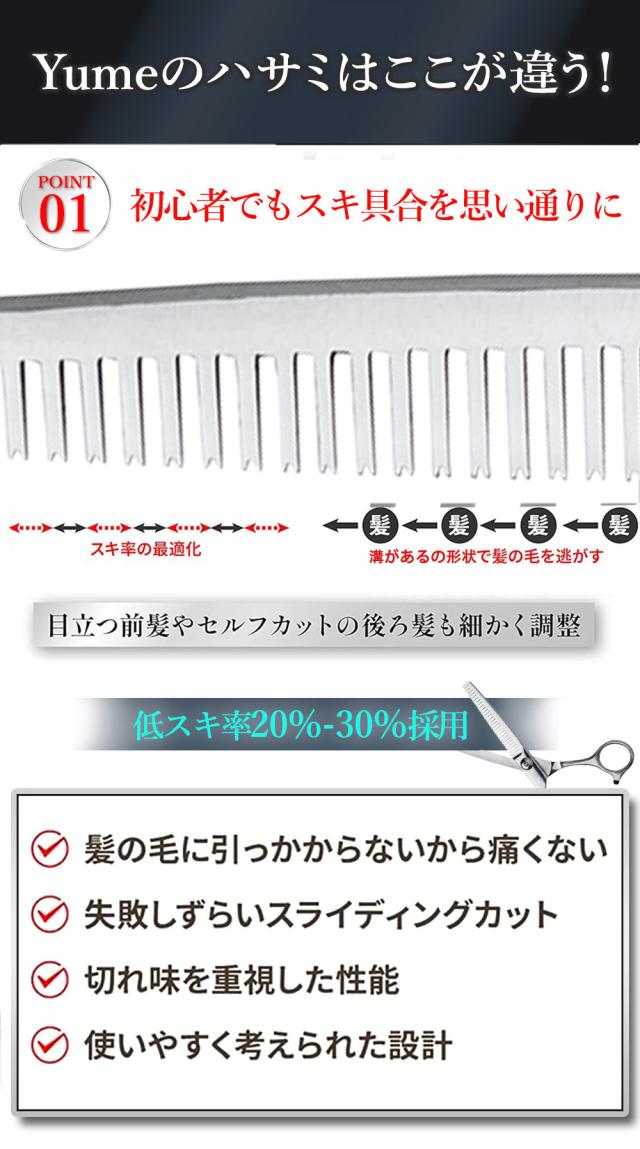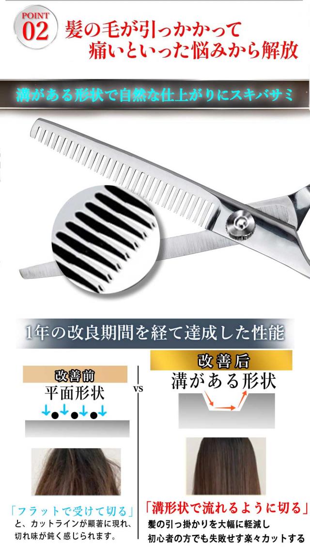 【失敗しにくい低スキ率15%採用】一般的なスキ率20%〜30%以上のすきばさみでは、切りすぎて失敗しやすくなってしまいます。そこで当店のすきばさみは失敗しにくい15%という低スキ率を採用。スキ率を抑えることによって、少量ずつ毛量を調整し“スキすぎる”ことなくカットができます。初心者の方でも失敗するリスクをおさえ、安心してセルフカットができます。