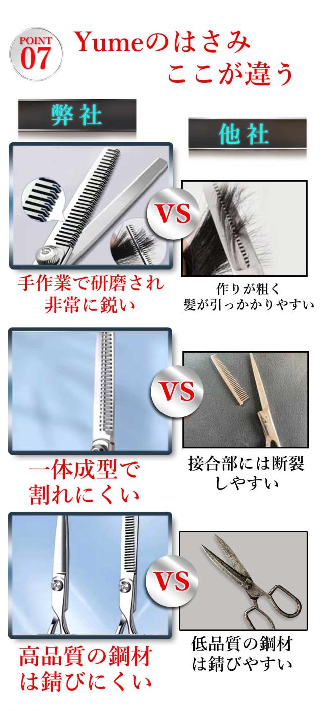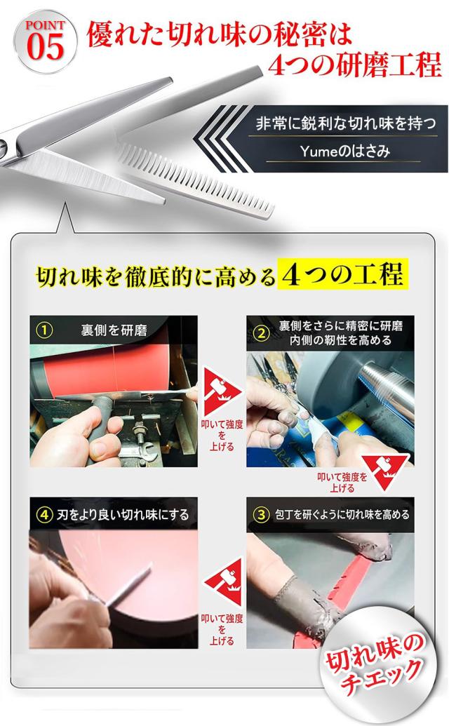 【”サクッ”と切れる刃の秘密は研磨工程】非常に鋭利な切れ味を持つYumeのはさみ。「セルフカット用のはさみは切れ味が悪くて使いにくい」悩みを解消するため、切れ味を徹底的に高める4つの研磨工程を経て出荷しています。 素材は耐久性に優れた高品質の”4CRステンレススチール”を採用。焼き入れを行い、高度と靭性を強化し「切れ味のよさ」を追求いたしました。