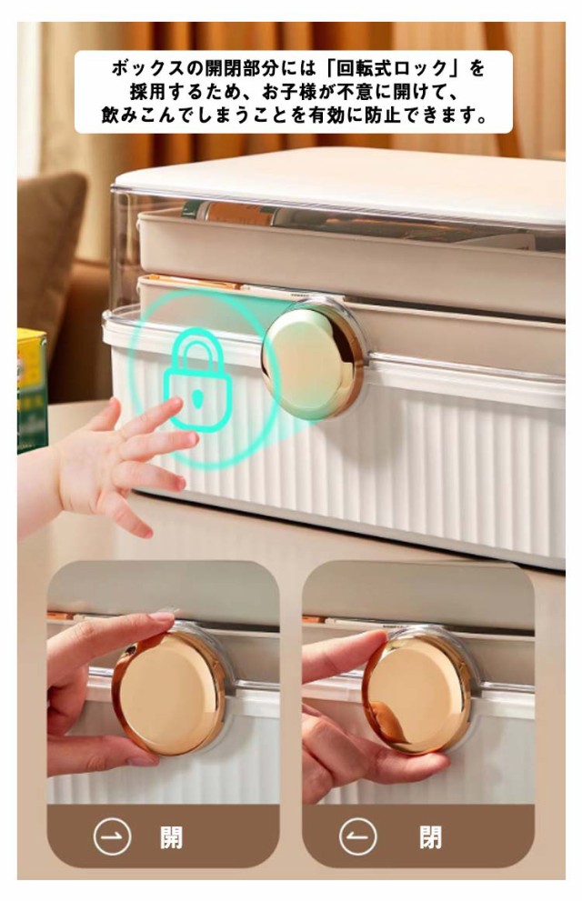 | 薬品分類楽々 三段式デザインのため、薬品の分類は簡単になります。一層目は急用の薬品、二層目は常用の薬品、三層目は予備用の薬品を入れることで、万が一の時に頼りになります。 「回転式ロック」採用 ボックスの開閉部分には「回転式ロック」を採用するため、お子様が不意に開けて、飲みこんでしまうことを有効に防止できます。 頑丈なブラケット ボックスを支えるブラケットが頑丈のため、180度開いても揺れることなくご使用できます。 | |