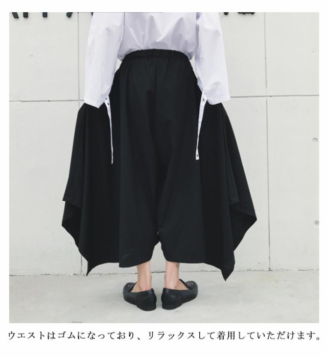 袴パンツ ワイドパンツ メンズ フレアパンツ v系 スカートパンツ スカート風 イレギュラー サルエルパンツ ロング丈 ゴムウエスト 薄手 落ち感 ストリート モード 大きいサイズ レディース ユニセックス 黒 ブラック 春 夏 秋 【送料無料】