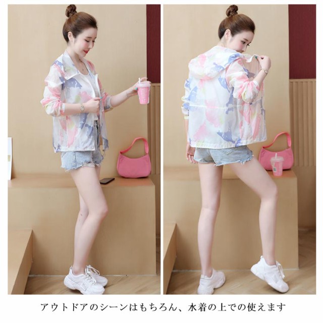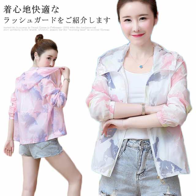 ラッシュガード レディース ラッシュパーカー フード付き 花柄 長袖 パーカー ジップアップ ゆったり ポケット付き 軽量 表面撥水 薄手 通気性 速乾性 お洒落 アウトドア 海辺 プール ジョギング フェス 体型カバー 夏新作