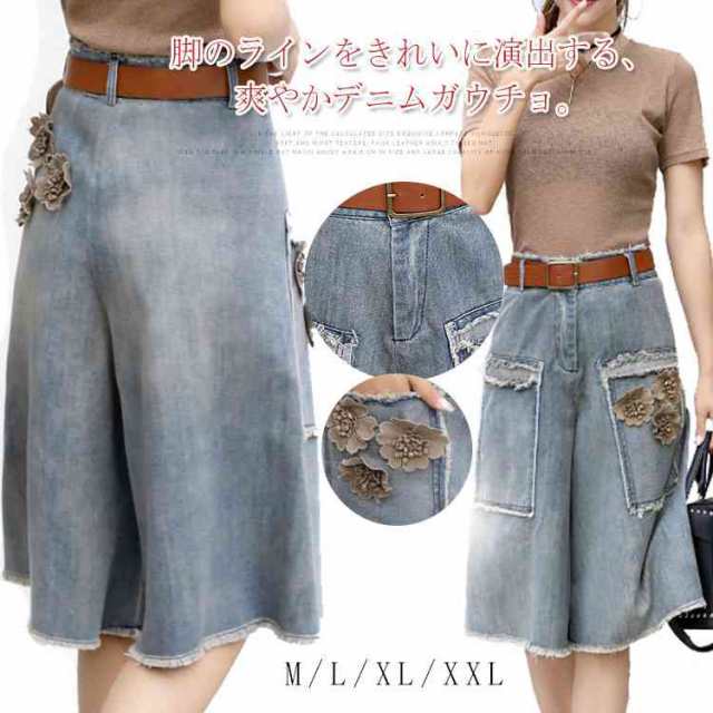 デニム ワイドパンツ 五分丈 パンツ ワイド ガウチョ フラワー飾り 体型カバー ゆったり 大人