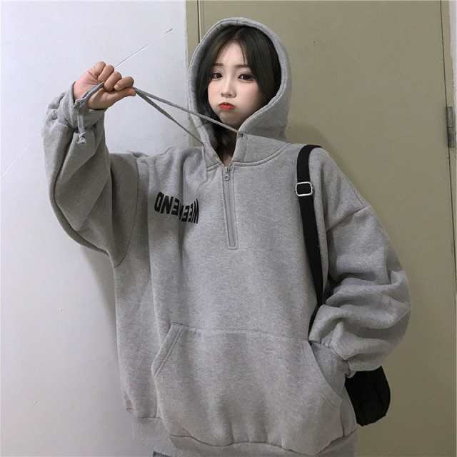 ハーフ ジップ パーカー 韓国 オルチャン ストリート 原宿系 アメカジ ロゴ 長袖 裏起毛 ライン K-POP ゆったり トレーナー スウェット トップス