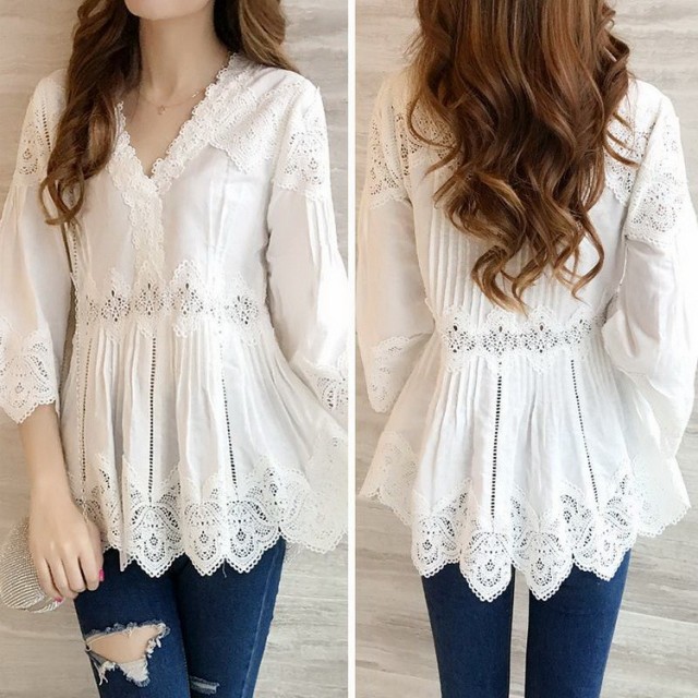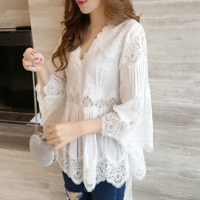 ブラウス レディース きれいめ 40代 春夏 上品 レース花刺繍ブラウス 白シャツ 七分袖 アレア オシャレブラウス vネックトップス 韓国風 大人 Tシャツ30代 50代
