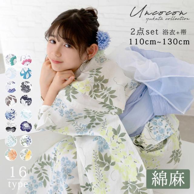 浴衣 子供 子ども 兵児帯 2点 セット 簡単着付け 花柄 かわいい おしゃれ モダン ゆかた 女の子 子供浴衣セット 綿麻 プチプラ 送料無料 レトロ 白 ピンク 水色 紺 ネイビー オレンジ グリーン 椿 菊 藤 110cm 120cm 130cm