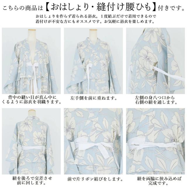 また、腰ひもが最初から縫い付け済みなので、浴衣初心者の方でも簡単に着付け可能。