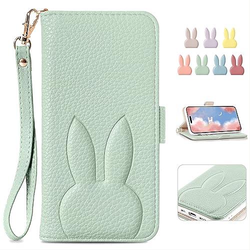 MAGICASE 適応 iPhone15 ケース 手帳型 あいふぉん15 手帳カバー アイフォン15保護ケース おしゃれ ウサギ カード収納 電話ケース 可愛い 財布型 兎 人気 レディース 女性 アイホン15 手帳型 かわいい 携帯ケース あいほん15 ケースカバー 肌感レザー 横置き機能 動物 高級PUレザー (6.1インチ) グリーン