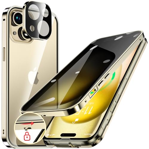 HGUTREY覗き見防止・自動ポップアップボタン iPhone15 用 ケース ロック付きストラップホール付き一体型レンズ保護 両面9H強化ガラス あいふぉん15ケース 耐衝撃 アルミ バンパー メタルフレーム スマホケース 薄型 背面クリア 高感度タッチ 軽量 すり傷防止 ワイヤレス充電対応 アイフォン15 用 カバー 6.1インチ(ゴールド)