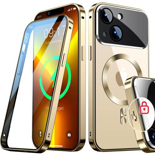 Rosycover新次元の一体型レンズ・メカニカルロックiPhone 13 用の ケース Mag-safe対応 [360°全面保護・両面強化ガラス][本体の色・CD Mag-safeリング]マグセーフ ワイヤレス充電対応 ストラップホール付き アルミ合金バンパース アイホン13 金属 ケースマホケース13 クリア 人気 6.1インチ(ゴールド)