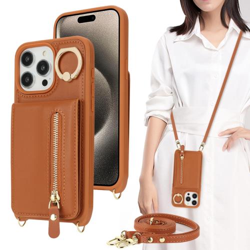 iPhone 15 Pro Max ケース ショルダー ストラップ付き ショルダーケース 背面フリップ 上下開 手帳型 アイホン 15プロマックス リング付き カバー スマホケース アイフォン15 pro max アイフォン 15プロマックス case 適用 iCoverCase リング付き カード収納 縦置き 横置き スタンド 肩がけ 首掛け 斜め掛け 携帯カバー ブラウン