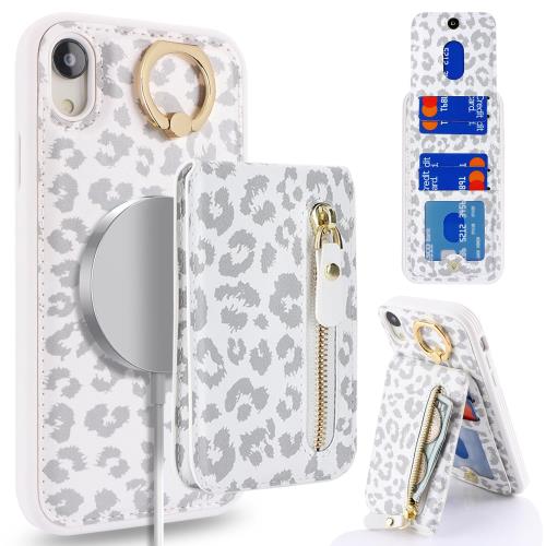 iPhone XR ケース 分離可 カードケース リング付きケース magsafe対応ケース マグセーフ magsafe用 アイホンxr リング付き iPhone 10R カバー スマホケース アイフォン10R アイホン XR case 適用 iCoverCase リング カード収納 スナップ 横置き スタンド マグネット カード入れ ファスナー 携帯カバー 豹柄 ヒョウ柄 ホワイト