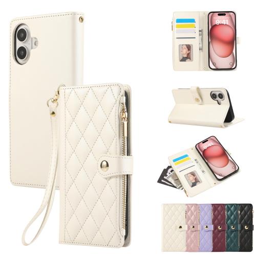 Rosbtib iPhone 16 ケース 手帳型 財布型 カバー iPhone16 ケース 手帳型 おしゃれ ファスナー型 小銭入れ カード収納 携帯カバー いphone 16 ケース 手帳型 エレガント チェック柄 刺繍 アイフォン16 ケース 高級PUレザー 肌触り良い ストラップ付き iPhone 16 スマホケース マグネット式開閉式 スタンド機能 全面保護(ホワイト)