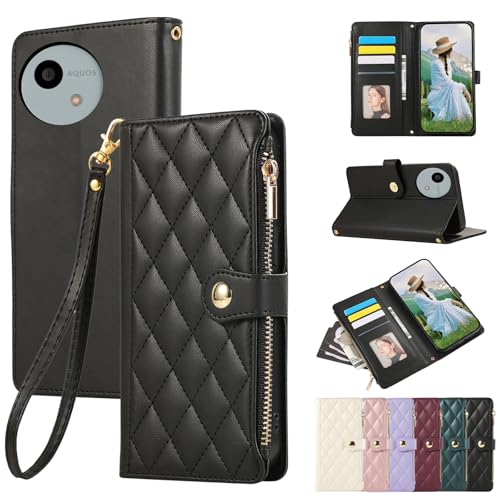 Rosbtib AQUOS wish4 ケース 手帳型 財布型 カバー docomo SH-52E ケース おしゃれ ファスナー型 小銭入れ カード収納 アクオスwish4ケース 携帯カバー SH-M27 ケース A402SH ケース チェック柄 刺繍 アクオスwish4 スマホケース PUレザー 肌触り良い ストラップ付き マグネット式開閉式 スタンド機能 全面保護(ブラック)