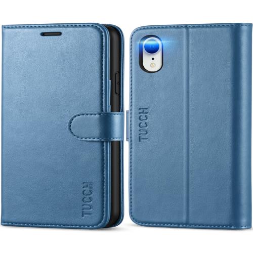 TUCCH iPhone XR 対応 ケース アイフォンxrケース 手帳型 高級合皮 TPUソフトケース 衝撃吸収 [RFIDブロッキング] カード入れ スタンド機能 マグネット式 留め具 iPhone XR 6.1インチ対応 レイクブルー