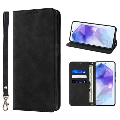 NanHou Samsung Galaxy A55 5G ケース 手帳型 つや消し レザー スタイル質感 SC-53E 手帳型 耐衝撃 保護カバー 内蔵マグネット 財布型 SC-53E 携帯カバー カードポケット スタンド機能 リストバンド Samsung A55 ケース - ブラック