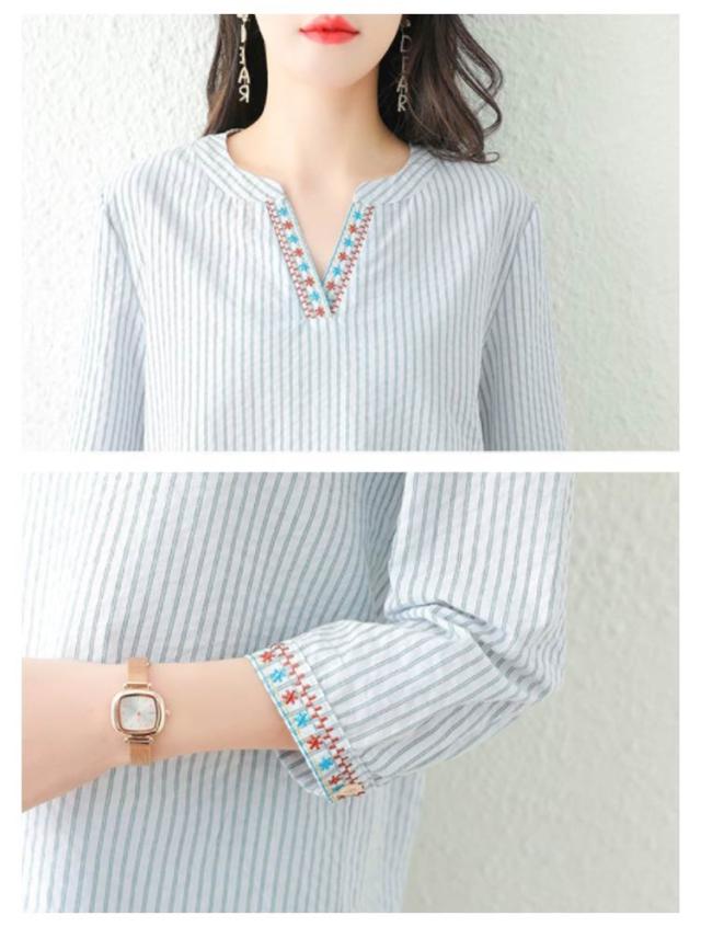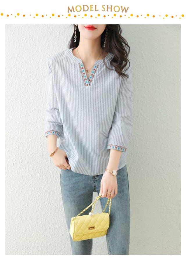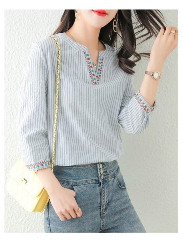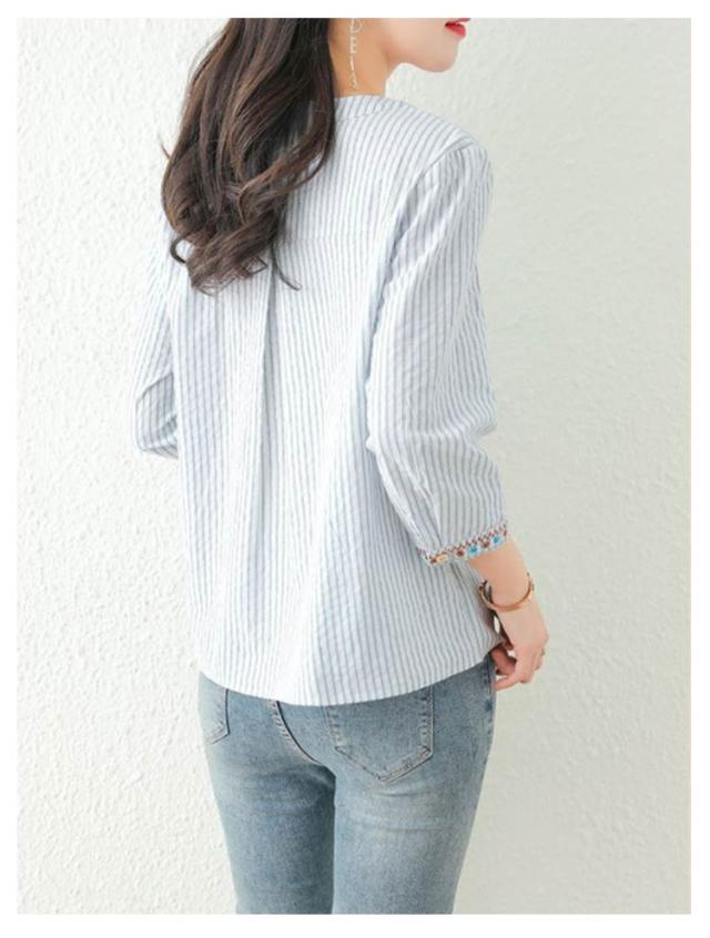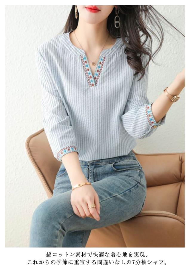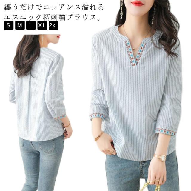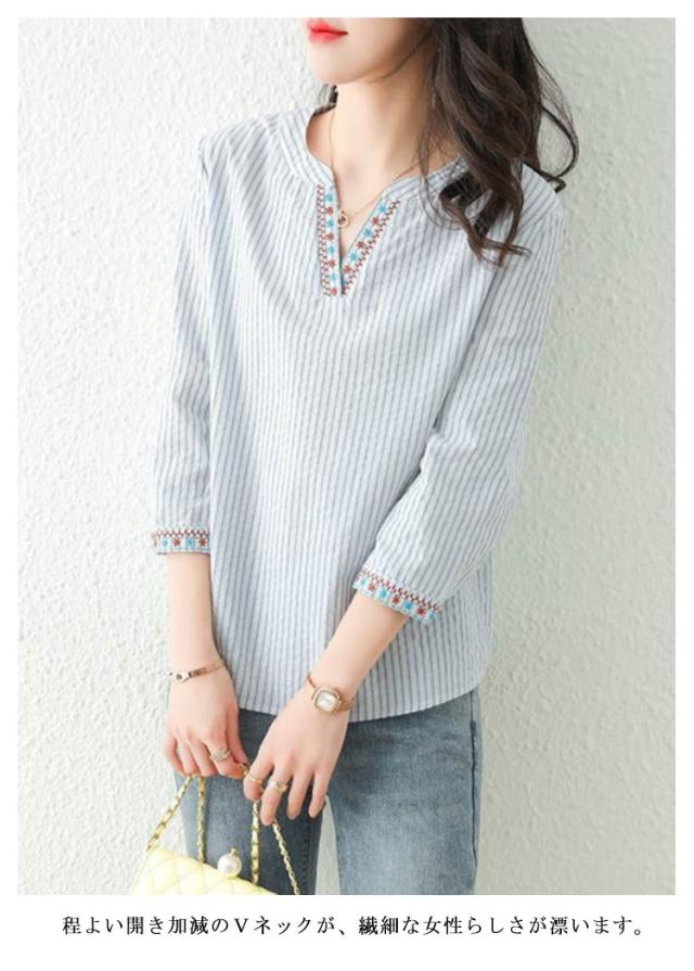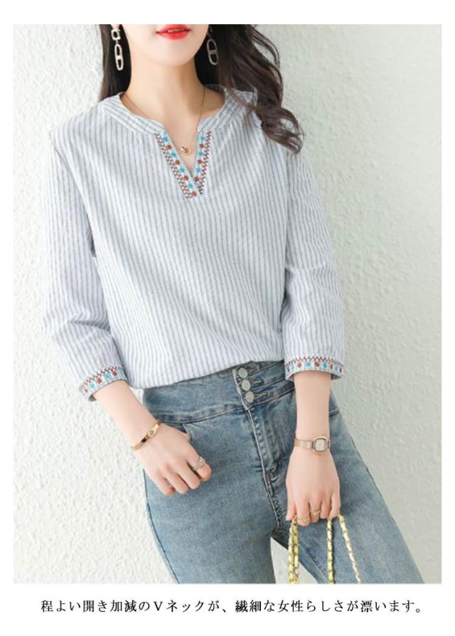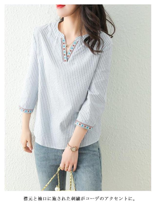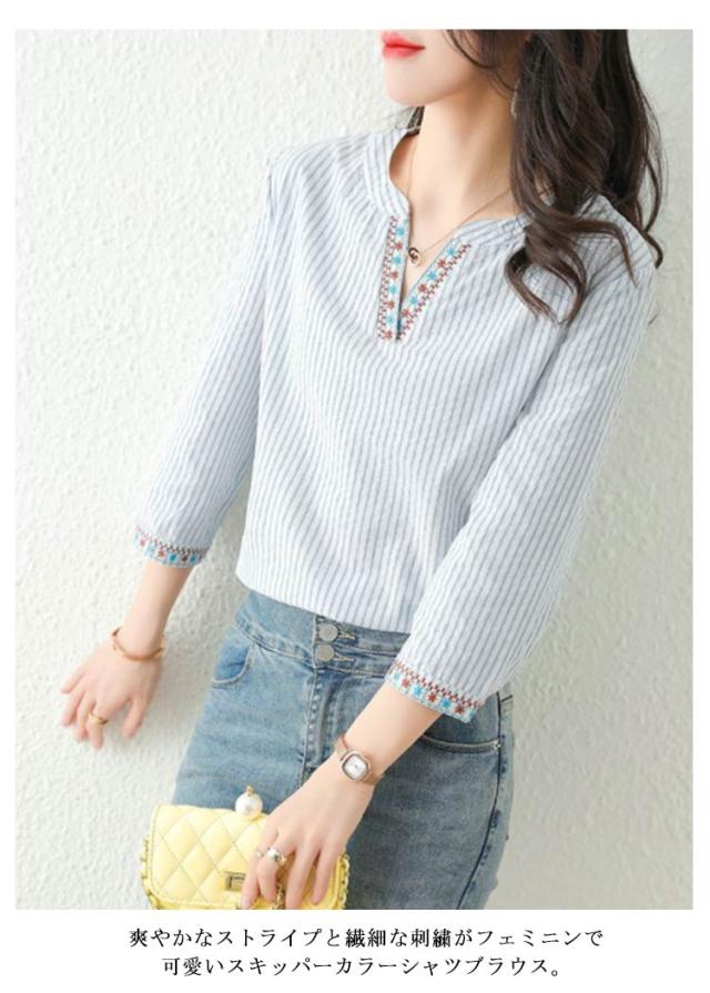 7分袖 ブラウス スキッパー シャツ ニュアンス柄刺繍 レディース トップス Vネック プルオーバー シャツブラウス 送料無料 フェミニン オフィスカジュアル ストライプ柄 春 夏服 オシャレ エスニック刺繍