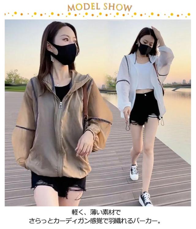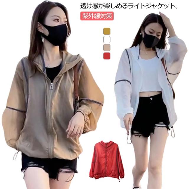 サマージャケット 日焼け止めパーカー 薄手ジャケット レディース 透け感 上着 ナイロンジャケット 軽アウター 送料無料 紫外線対策 冷房対策 春 ライトアウター カーディガン 羽織り 薄手 シアーブルゾン フード付き UVパーカー