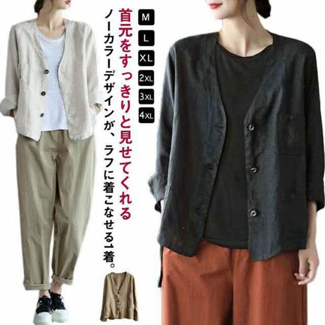 サマージャケット ノーカラージャケット 綿麻ジャケット リネンジャケット 襟なし アウター サマー ジャケット ブルゾン ノーカラー 羽織 伸縮性 高見え 着回し 大人 上品 レディース 綿麻 薄手 ゆったり 冷房対策 着痩せ 大人 通勤 送料無料