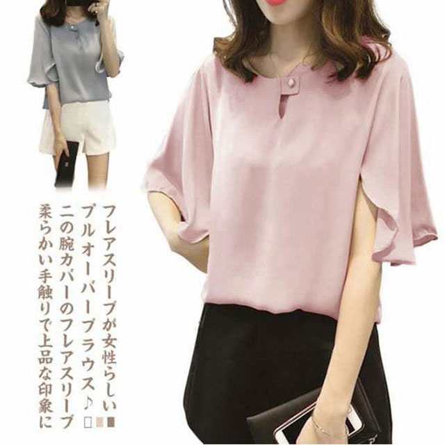 フレアスリーブ プルオーバー シフォン ブラウス 白 ホワイト グレー ピンク 無地 シンプル 着回し 5分袖 クルーネック 半袖 トップス 春 夏 おしゃれ 流行 可愛い きれいめ カジュアル フェミニン オフィス 会社 仕事 上品 韓国ファッション 送料無料